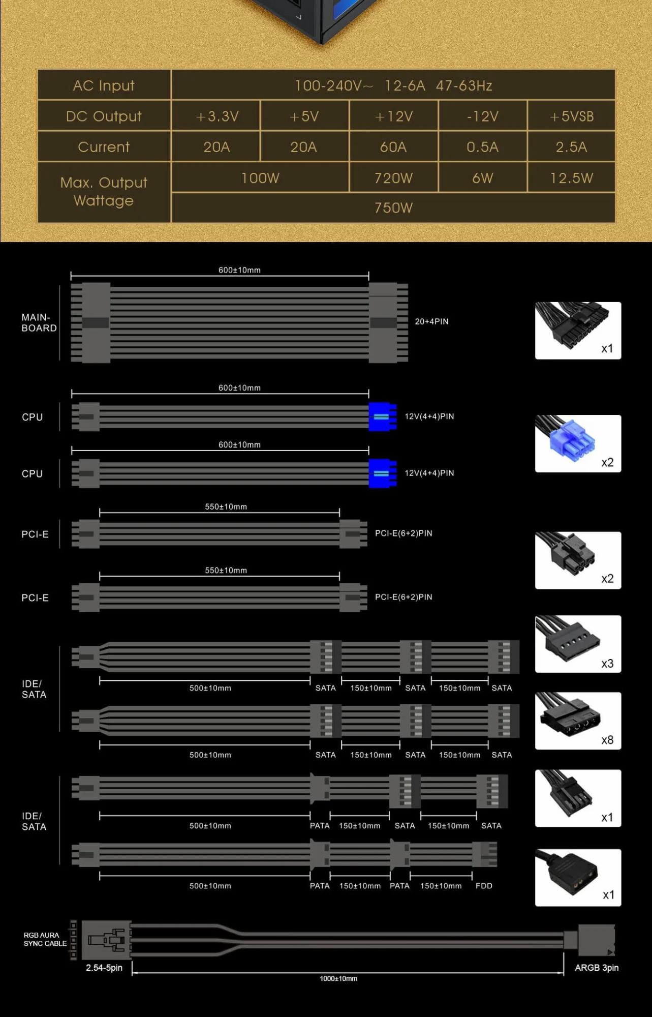 - Certificación 80 Plus Gold: RGB-750 PRO con una eficiencia del 90 % o más bajo cargas típicas.